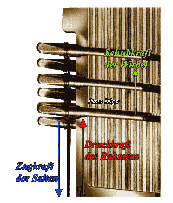 Gußplatte einzuleiten. Das hat zur Folge, dass erstmalig der immer noch dahinter befindliche Stimmstock die Stimmwirbel “nur noch” am selbständigen Verdrehen hindern muß. Um die Kraft gleichmäßig auf die