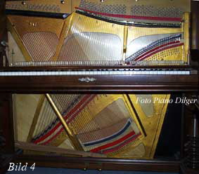 Ein großer Schritt hin zu klangvolleren Klavieren war die Idee, die Baßsaiten durch diagonale Anordnung über den Diskantsaiten -bei gleicher Bauhöhe eines Instrumentes- länger ausführen zu können (Bild 4). Nach diesem Prinzip besaitet man auch heute noch Klaviere, jedoch werden die Instrumente heute konsequent durchkonstruiert mit Rahmen, die bis auf das Bodenbrett reichen und Baßsaiten, die den Diskant in noch flacherem Winkel kreuzen (vergleiche Bild 5 mit Bild 7).